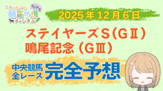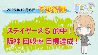 2025年12月6日に開催された、中山・阪神・中京競馬場全レースを予想した結果の的中率、回収率をお知らせしています。