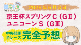 競馬予想 2025年5月3日 中央競馬 ワイド予想 2025年5月3日にJRA(日本中央競馬会)が主催する京王杯スプリングC・ユニコーンSのほか、東京・京都・新潟競馬場全レースの予想を公開しています。予想した馬券はワイドフォーメーションのみで購入し、的中率、回収率の100%オーバーを目指しています。 2025.05.03 競馬予想